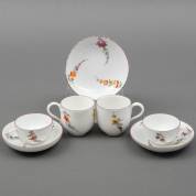 Vier diverse porseleinen kopjes en drie schoteltjes, alle met gelijkend polychroom bloemdecor, uitvoering Meissen, Marcolini-periode, gemerkt -één schoteltje met randchips-, 7,5 × Ø 12 cm