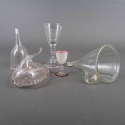 Donderglas met geknepen glasranden, 19e eeuw, glas met geëtst vogeldecor, glaasje met rood-wit spiraalvormig decor, en twee glazen trechters, alle 19e eeuw, grootste trechter 21 × 11,5 cm