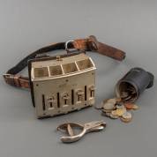 Metalen mechanische geldwisselautomaat, model Syro Wisselaar, Zwitserland, gebruikt op RET lijnen, aan lederen band met metalen kaartjesknipper, de wisselaar gevuld met muntgeld, circa 1950 -gebruikssporen-, daarbij koker met buitenlands muntgeld