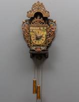 Friese stoelklok met beschilderde wijzerplaat, de blikken fretten met staande leeuwen, de achterplaat met bazuinengelen, eind 20e eeuw, 47 × 28 × 14 cm