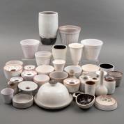 Diverse bruine/beige keramische vaasjes, asbakjes, bloemstekers, kaasstolp etc., waaronder uitvoering Nagtegaal Utrecht, Westraven Utrecht, Ravelli, Mobach Utrecht -kleine chipjes-, grote vaas: 20 cm