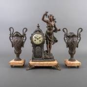 Driedelig klokkenstel, de beeldpendule met bloemenstrooiende vrouw, staand op roze natuurstenen basement, 19e eeuw -één pootje defect, defecten aan cassolettes-, 45 × 27 × 17 cm