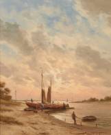 Herman Jozef Wijngaard (1922-2012), riviergezicht met aangemeerde platbodems, olieverf op doek, r.o. gesigneerd, 60 × 50 cm
