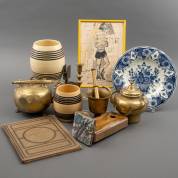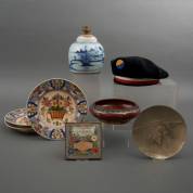 Divers kleingoed: cloisonné schaaltje, gemberpot vermaakt tot lampvoet, tegel, hoedje, etc.