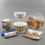 Divers aardewerk: twee schalen en een kan met Afrikaanse dierendecor, twee Chinese cachepots met floraal decor en een sierschaal met Neuschwanstein decor, uitvoering Sarreguemines, Frankrijk, alle modern -lichte gebruikssporen-, sierschaalØ 33,5 cm