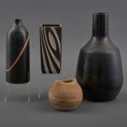 Vier aardewerk vaasjes: twee uitvoering Ravelli -één met bakfout-, en twee donkergekleurde, jaren '60-'70, 27 × 15 cm
