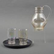 Iriserend glazen waterstel KO 689/690 op zwarte persglazen onderschotel, ontwerp Andries Dirk Copier, uitvoering Glasfabriek Leerdam, 1923, gemerkt -één glas met chip langs de rand-, 20 cm