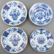 Vier diverse Delfts aardewerk bordjes, waaronder één paar, alle met bloemenmanddecor, uitvoering paar De Porceleyne Bijl, 18e eeuw, grootste Ø 25,5 cm