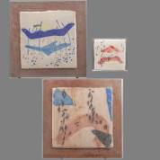 Hanna Mobach (1934), drie gemodelleerde tegels met abstracte composities, waarvan twee gemonteerd op metalen plaat, verso gesigneerd op label, grootste tegel 38 × 38