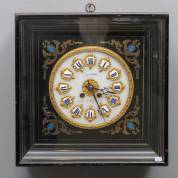 Vierkante oeuil de boeuf wandklok, de albasten wijzerplaat met Romeinse cijfers in geëmailleerde cartouches, daaromheen Boulle-marqueterie, Frankrijk, eind 19e eeuw, 41 × 41 × 15 cm