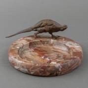 Ronde marmeren vide-poche met bronzen fazant op de rand -restauraties-, Ø 19,5 cm