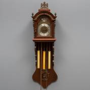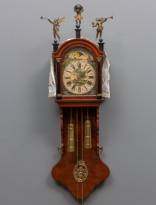 Friese staartklok in eiken kast, bekroond door wapenschildje, tweede helft 20e eeuw, 116 × 31 × 20,5 cm