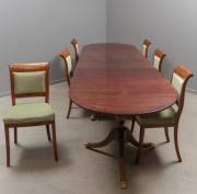 Mahonie 'three pillar dining table' met twee tussenbladen, 20e eeuw -gebruikssporen op blad-, en zes mahonie stoelen met olijfgroene velours bekleding, tweede helft 19e eeuw