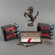 Bronzen sculptuur: cavallino rapante, gegoten ter gelegenheid van de opening van het Kroymans Ferrari gebouw, 1989, oplage 23/250, daarbij: Ferrari Formula vulpen in foedraal, 1983 -gebruikssporen-, en vier Ferrari kunststof en metalen modelauto's