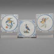 Drie Delfts aardewerk cirkeltegels met polychroom vogeldecor: ooievaar, papegaai, en mus, 17e eeuw, 12,7 × 12,7 cm