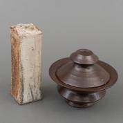 Twee keramische objecten: Johnny Rolf (1936), rechthoekig vaasje met dubbele opening, gemerkt, en Jan de Rooden (1931-2016), bedekte bruingeglazuurde kom, gemerkt en gedateerd '61, 14 × Ø 17 cm