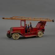 Blikken brandweerladderwagen, bemand door vier brandweerlieden, 17 × 44 × 15 cm