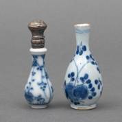 Delfts aardewerk miniatuurvaasje, 18e eeuw -klein defect in buik-, en een Duits porseleinen parfumflacon met zilveren dop -dop defect-, 19e eeuw, hoogte 8 cm