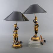 Paar tafellampen met porteur en porteuse, met zwarte kappen voorzien van gouden binnenzijde, modern -beide met schade bij de voeten-, 60 cm
