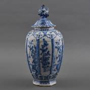 Delfts aardewerk vaas met blauw-wit chinoiseriedecor, gemerkt, vermoedelijk uitvoering De Porceleijne Klaauw -schilfers, enkele ingekleurd-, en afwijkend rocaillevormig deksel met leeuwtje bovenop, gemerkt, vermoedelijk uitvoering De Lampetkan-schilfers en chips-, hoogte 44 cm