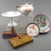 Porseleinen chocoladepot met bloemdecor, 19e eeuw, porseleinen tazza, dienblaadje met nikkelen rand, drie aardewerk bordjes met bloemdecor, Frankrijk, blikken stofdoos met beschildering -sleets-, en kleine metalen kruik, chocoladepot: Ø 19 cm