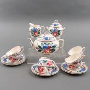 Aardewerk achtpersoons theeservies met beschilderd bloemdecor, uitvoering Sarreguemines -één kopje beschadigd-, hoogte theepot 13,5 cm