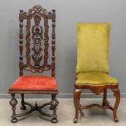 Noten stoel met groen velours bekleding, en eiken stoel met rood velours bekleding, beide barok, 131 × 56 × 58 cm