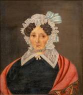 Hollandse of Duitse School: portret van een vrouw met kant en wit-blauw lint om het hoofd, olieverf op doek, niet gesigneerd, circa tweede kwart 19e eeuw -gedoubleerd, loszittende verf-, 32 × 28 cm