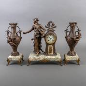 Driedelig klokkenstel, de beeldpendule met zaaiende vrouw, staand op Calacatta-marmeren basement, adres: H.J. Boss, Groningen, 19e eeuw, 45 × 40 × 16 cm