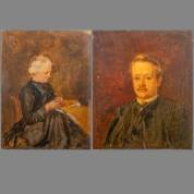 Hollandse School: portret van Prof. Dr. S. Hoogewerff 83 j., en portret van Mw. A.S. Hoogewerff- van Stolk, beide olieverf op doek, gesigneerd N.A. Hoogewerff -beschadigingen, verfverlies-, 38 × 28 cm