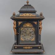 Gezwart houten mantelklok met verguld bronzen appliques, de verzilverde wijzerplaat met Romeinse cijfers, uitvoering Junghans, eind 19e eeuw -profiel op hoek achter beschadigd, gebruikssporen-, 50 × 31 × 18 cm