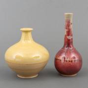 Henk Verberkmoes (1923-2003), geelgeglazuurd flesvaasje, daarbij roodgeglazuurd steelvaasje, 20 × 19 cm