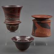 Sonja Landweer (1933-2019), twee keramische vaasjes met glazuur in aardetinten, jaren '80 -een vaasje op onderzijde toeschrijving in potlood aan Jan Broekman, maar niet van zijn hand-, daarbij: bruingeglazuurd kommetje, 17 × Ø 12 cm