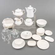Aardewerk kinderserviesgedeelte, uitvoering Petrus Regout, porseleinen kinderkoffiepot en glazen kinderserviesdelen -gebruikssporen-, hoogte koffiepot 12,5 cm