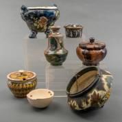 Plateel vaasje, art nouveau, plateel hangplantenbak, uitvoering Plateelfabriek Zuid-Holland, Gouda, plateel cache-pot, art nouveau, uitvoering Rozenburg, Den Haag, drie aardewerk dekseldoosjes, en porseleinen kommetje met insectdecor -cache-pot met sterbarst-, vaasje: 16 cm
