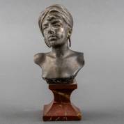 Zamak buste van een vrouw, gesigneerd E. Villanis, op rood marmeren basementje -defect-, hoogte 14 cm