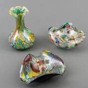 Twee glazen bakjes en één vaasje, alle met veelkleurige geabstraheerde decors, alle Murano, midden 20e eeuw, vaasje 16 cm hoog