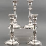 Vier verzilverde hoge kandelaars op ovale voet met bobèche, 14 × 12 × 26 cm
