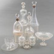 Kristallen knijpkaraf met geëtst decor van een kerk en molen -aanslag-, glazen knijpfles, twee kristallen karaffen, waarvan één met 2e gehalte zilveren schenkrand, kristallen druivenspoeler op onderschotel met geëtst wijnrankdecor, kristallen tazza en zuurstel, 14 × ø 22 cm