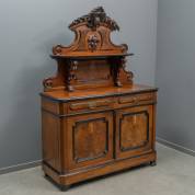 Noten en mahonie buffetkast met opstand, versierd met gestoken bloemdecors en gezwarte accenten, 190 × 139 × 50 cm