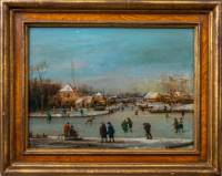 Hollandse School: wintergezicht met vele figuren op het ijs, marouflé, niet gesigneerd, 21,5 × 29,5 cm