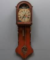 Friese staartklok in roodgebeitste eiken kast, met scheepjesmechaniek, de polychroom beschilderde wijzerplaat met figuren, 19e eeuw -beschadigingen, glasplaat afwezig, missende regel van kap, zonder ornamenten-