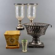 Paar kristallen windlichten, zinken jardinière, blikken beschilderd vaasje en metalen beschilderde cache-pot, hoogte windlichten: 42 cm