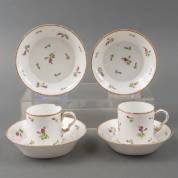 Twee porseleinen kop-en-schotels en twee grotere schoteltjes, alle met strooibloemdecor, uitvoering Fabrique De Monsieur, Clignancourt, laatste kwart 18e eeuw -beide kopjes en één schotel gebarsten-, schotel Ø 13,5 cm