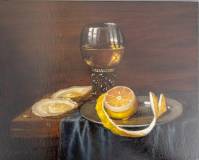 Hollandse School: stilleven met oesters, roemer en citroen, olieverf op massoniet, l.o. gesigneerd C. Cornelisz., 20 × 25 cm