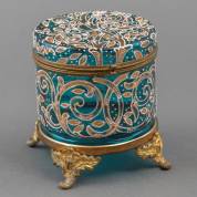 Glazen dekseldoos met verguld en witgeëmailleerd floraal decor en voorzien van vergulde metalen monturen, 11,5 × Ø 10 cm