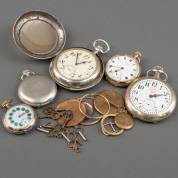 Vijf zakhorloges, de grootste geadresseerd Doxa, Hors Concours, Liège, 1905, in extra beschermkast, andere grote exemplaar geadresseerd Messagero, één verguld geadresseerd H. Samuel, Manchester, één met dichte kast, de ander met wit- en groengeëmailleerde wijzerplaat en diverse horlogesleuteltjes en onderdelen