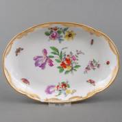 Ovaal porseleinen schaaltje met polychroom beschilderd decor van bloemen en insecten, naar Meissen voorbeeld, gemerkt, uitvoering Samson, 19e eeuw -randchip-, 21,5 × 15 cm, herkomst: privécollectie van kunsthandelaar Abraham van der Meer (1927-2008), destijds gevestigd op de Spiegelgracht 3 te Amsterdam