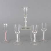 Vijf slingerglazen: set van drie met dubbele witte slinger, één met dubbele witte slinger en twee knopen in de stam, en de laatste met dubbele wit-rode slinger, alle 18e eeuw, grootste 17,5 cm hoog -meerdere chips-