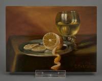 Hollandse School: stilleven met citroen en roemer, olieverf op paneel, r.o. gesigneerd C. Cornelisz., 13 × 18 cm